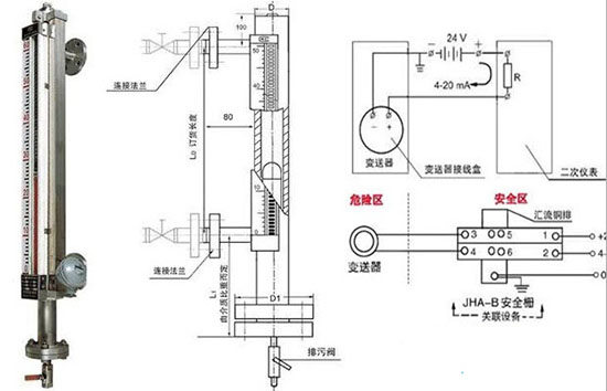 液體液位計(jì)是以浮子內(nèi)磁鋼驅(qū)動(dòng)雙色薄片的翻轉(zhuǎn)來(lái)指示液位的一種新型儀表,主體不銹鋼內(nèi)腔管中磁浮子隨液位的升降而上下運(yùn)動(dòng),同時(shí)驅(qū)使主體外指示器內(nèi)的雙色薄片翻轉(zhuǎn),有液位時(shí)轉(zhuǎn)示紅色、無(wú)液位時(shí)顯示白色。液體液位計(jì)以紅色和白色色帶間的界線即代表液位高度。在指示器左側(cè)配有醒目的刻度標(biāo)尺,從而使液位的指示顯得更加清晰。不僅可以實(shí)現(xiàn)現(xiàn)場(chǎng)就地觀測(cè),也可以加裝遠(yuǎn)傳裝置實(shí)現(xiàn)遠(yuǎn)程監(jiān)控及報(bào)警等功能。