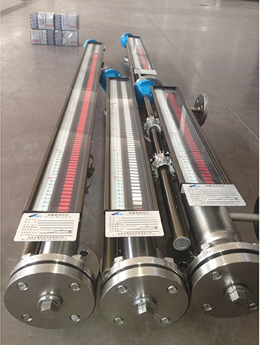 液位計根據浮力原理,浮子在測量管內隨液位的升降而上下移動,浮子內的永久磁鋼通過磁耦合作用,驅動紅、白色翻柱翻轉180’液位上升時,翻柱由白色轉為紅色,下降時,翻柱由紅色轉為白色,從而實現液位的指示。