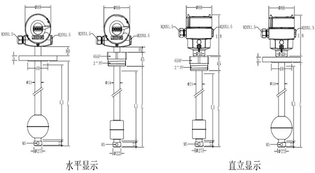 為更直觀地給用戶展現不銹鋼浮球液位計的規格,請參考兩種不銹鋼浮球液位計水平顯示以及直立顯示的不同規格尺寸,如下圖所示: