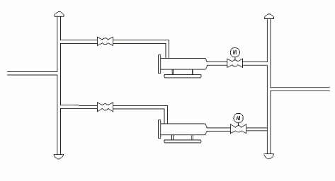在輸氣站場根據(jù)下游用戶年設(shè)計(jì)輸氣量及檢維修需求通常設(shè)置兩臺臥式過濾分離器,運(yùn)行時通常采用一用一備方式運(yùn)行,氣量需求高峰時段達(dá)到單臺處理量時兩臺同時運(yùn)行以滿足用戶氣量需求。過濾分離器在整個輸氣站場工藝流程中通過法蘭與管道相連,同時上下游均設(shè)置球閥(見圖1),其中下游球閥與電動執(zhí)行機(jī)構(gòu)相匹配使用,能實(shí)現(xiàn)遠(yuǎn)程開關(guān)控制。在正常運(yùn)行狀態(tài)下,在用過濾分離支路的上下游球閥處于完全開啟狀態(tài),備用過濾分離支路的上游球閥處于開啟狀態(tài),下游球閥處于關(guān)閉狀態(tài)。對于過濾分離器切換有兩種方式:一種是手動模式,另一種是自動模式。在手動模式下可由操作人員通過遠(yuǎn)程和就地狀態(tài)下實(shí)現(xiàn)過濾支路流程切換;當(dāng)在自動模式下電動閥產(chǎn)生事故關(guān)斷時,則報警并自動選擇備用設(shè)備,打開備用支路的電動閥,關(guān)閉當(dāng)前支路的電動閥門,實(shí)現(xiàn)工作分離器和備用分離器的切換,上述過程由程序自動完成,不需人為干預(yù)。
